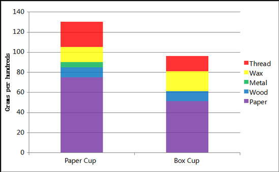 该题目的独特性在于条形图中组合着子部分,写法完全可以参考饼状图的对比描写。同时,切记,左边的公司纸杯比右边的多一种材料消耗,一定要在文中提及。