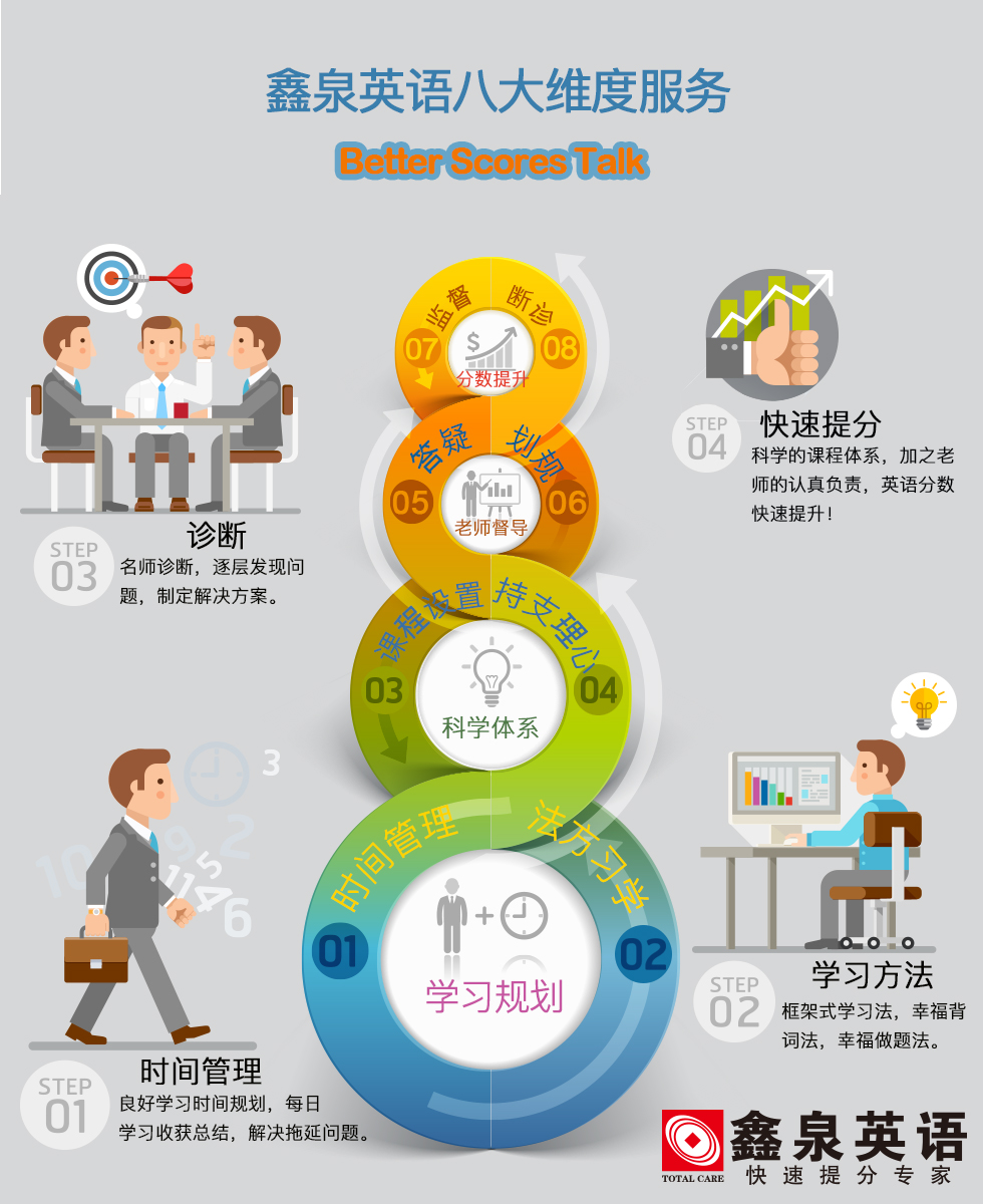 申请海外留学的学生在申请海外学校的时候都需要提供相应达标的语言成绩,不同排名的大学对于申请人的语言成绩要求各不相同,所以申请人必须在申请截止前提交一份漂亮的语言成绩。为了达到比较满意的语言分数,很多学生从高一或者高二,有的甚至会在初中阶段就已经开始准备语言考试了。传统的语言培训机构只给学生提供相应语言考试各科的授课服务,而并未详细为学生安排好申请前需要参加几次考试才能达到理想分数,每次考试的目标分数是多少,为了达到目的分数,学生应该学习什么教材,每天安排什么学习任务等等。Rome is not built in a day.我们知道,学生为了最终能拿到一个满意的语言考试分数,可能需要准备一年甚至更久,而有的学生可能准备的时间相当有限顶多只有半年,这些不同学习时长学生的考试计划、学习计划又应该如何安排呢?为了帮助学生解决这一问题,鑫泉英语的学习规划服务便应运而生。———立即预约鑫泉英语钻石级名师,让快速提分不是梦想!
