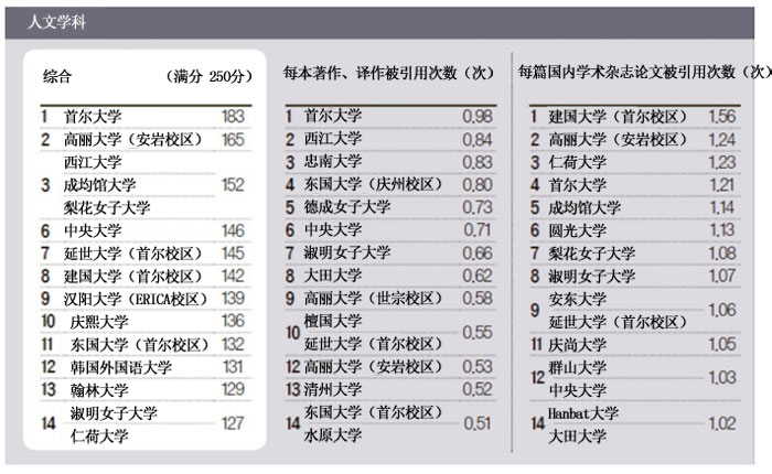 首尔大学在本报学科评估工作的人文和社会学科排名中都高居第一名,在教授研究领域领先于其他大学。本报与韩国研究财团一同针对2010年~2013年大学教授出版的4万余本著作和译作进行分析后发现,首尔大学人文与社会学科教授出版的著作和译作被其他研究者引用的次数最多。各部著作中,首尔大学校长成乐寅(法学专业研究生院教授)撰写的《宪法学》被引用次数最多;各部译作中,首尔大学德文系教授金泰焕(音)翻译出版的《疲劳社会》(在德学者韩秉哲著)被引用次数最多。