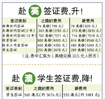 澳大利亚政府也从2012年开始陆续采用新的签证收费体制,费用变化涵盖移民、商务等多种签证。但学生签证费不升反降,从565澳元(约人民币3676元)下调为535澳元(约人民币3481元)。此外,旅游签证费也不变,以支持留学市场和旅游业。