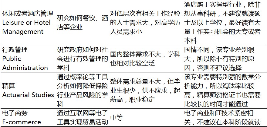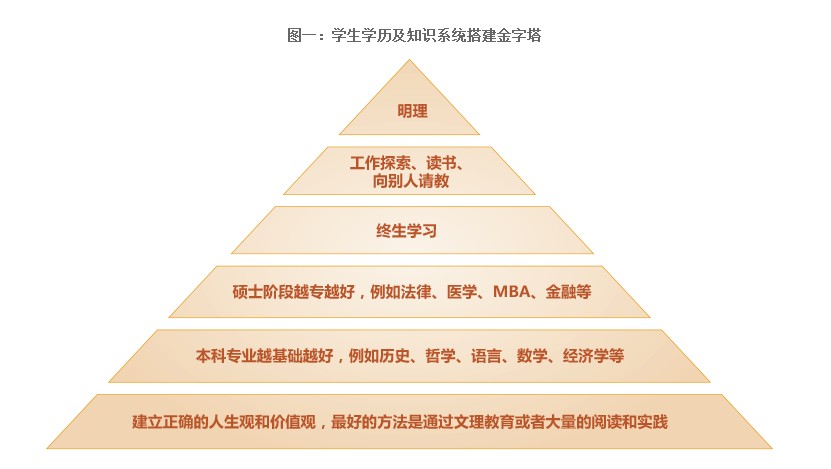 首先来看看职业成功的要素,主要有:勤奋、广博的知识和学习能力、沟通、领导力及运气。勤奋来自于成功动机,成功动机来自于明白自己要什么,什么才能给自己成就感,这一点本科教育的意义特别重大,这就是为什么西方文理教育的精髓,即通过大量的多领域的阅读和探索,通过和教师的讨论以及自己的实践,获得对自我以及外在世界的客观认识,从而清楚自己到底想要什么,什么可以给自己激情,所以西方,尤其是美国的精英大学很少有类似会计、管理类的学科,大部分是类似历史、哲学、语言类等学科。因为本科教育的任务是形成正确的世界观和人生观、具有批判性的思维。如果学生不进入例如美国的文理学院,那么从这个角度,也需要选择一些基础性的学科进行选择。除了历史、哲学外,还可以选择例如数学,因为数学是几乎所有现代理论体系的基础;例如经济学,因为经济学几乎是所有现代商科的基础。