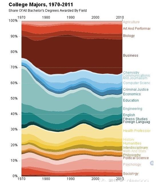 PS:图中每一条色带代表一种专业,而色带的上下高度则代表了该专业的本科生占当年的总的本科生的比率。