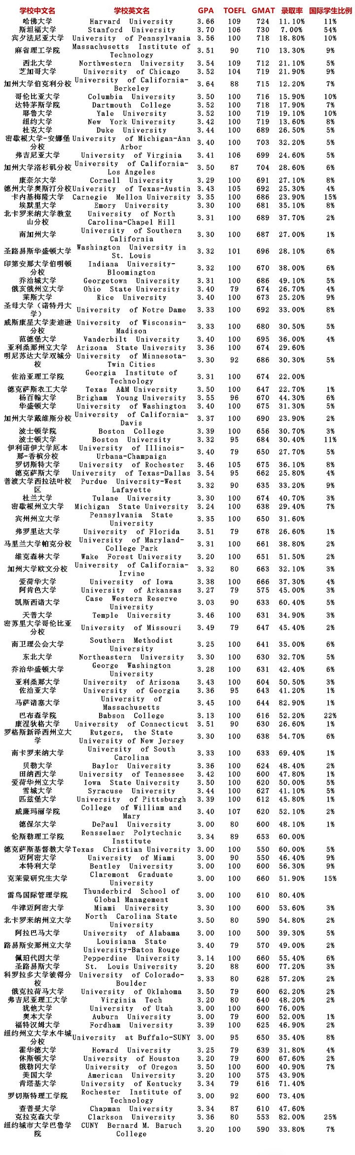 美国Top100名校GPA、TOEFL、GMAT录取要求汇总表