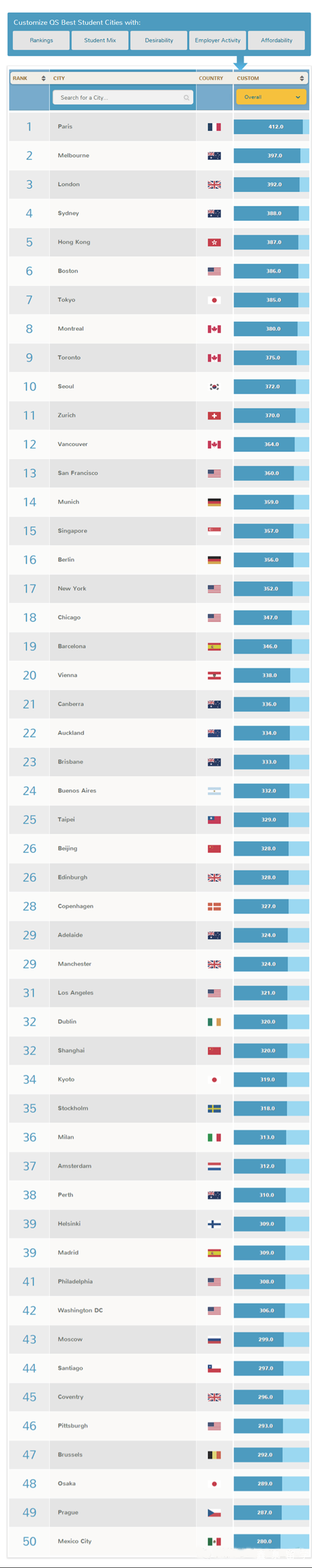 2015年度QS最佳求学城市Top 50最全中文榜单!!!