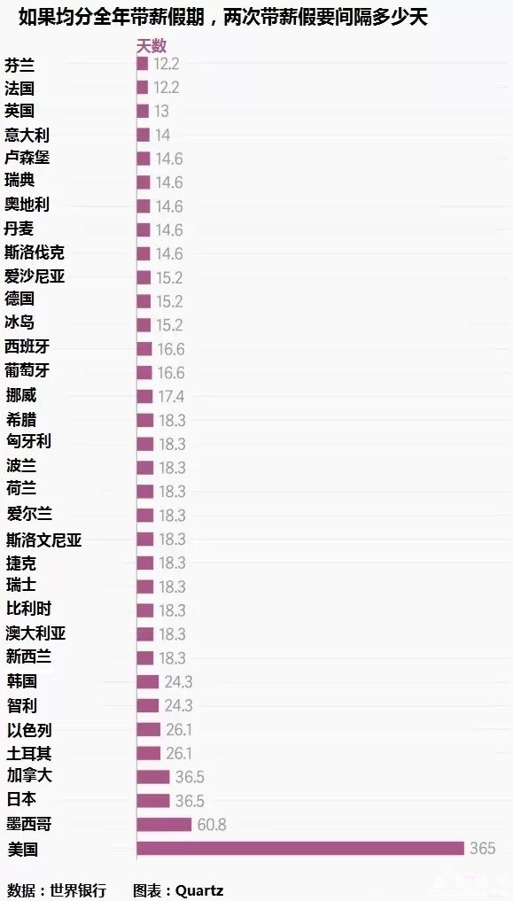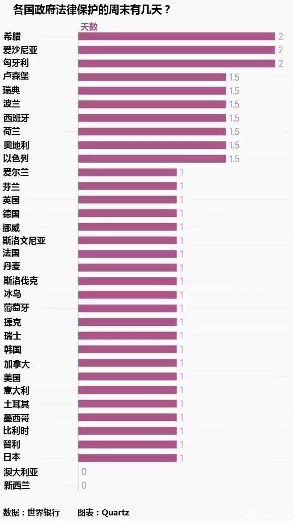 中国内地现在普遍实行每周双休日,哪些国家法律规定每周有两个休息日?世界银行统计的数据显示,其实双休日得到政府法律保护的国家也不多。希腊虽然失业率全球第一,但还规定劳动者一周拥有两个休息日,德国一周只有一天休息得到法律保护。难怪欧洲债务危机期间一些德国选民反对救助希腊,因为他们觉得希腊人好吃懒做。