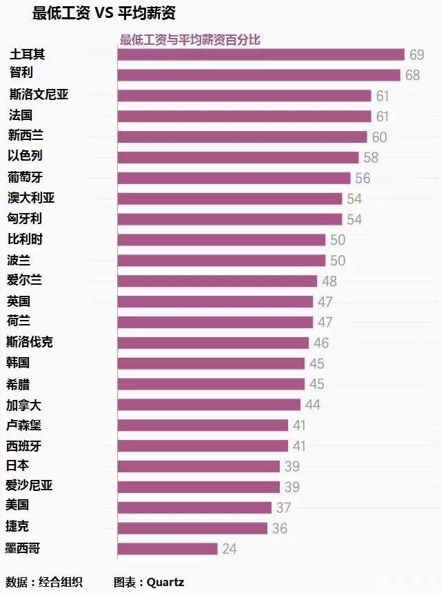 收入和休假同样是打工族最关心的一项指标,比较各国最低工资会发现,土耳其的最低工资几乎相当于70%的平均薪资,而美国的最低工资也只有平均薪资的三分之一。