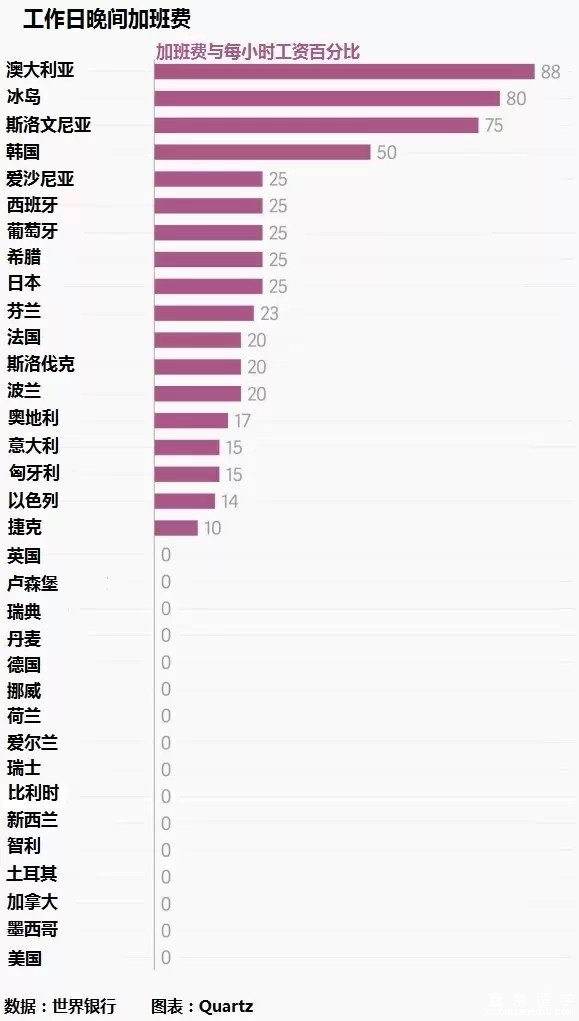 除了正常上班,加班也决定了打工族的收入高低。论加班,澳大利亚劳动者的收入最高,他们的加班费相当于88%的工资。而在英国、德国、丹麦等欧洲国家和美国,加班费只是个传说。
