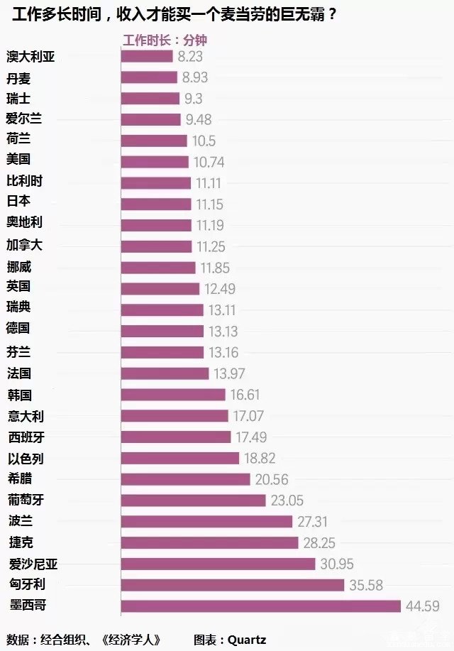 即使按同样的货币衡量,在美国花100元和在中国花100元也不会买到同样多的东西。所以,有必要在比较打工者收入时考虑到各国的购买力。经合组织和《经济学人》数据显示,在澳大利亚和丹麦,打工者只要工作8分钟左右,收入就可以买一个麦当劳的巨无霸,而在墨西哥,买一个巨无霸得工作将近45分钟。