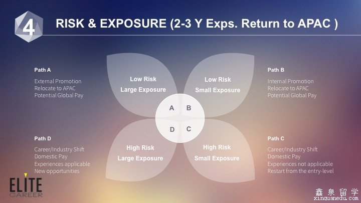 Path B:小军美国某TOP 50大学毕业,在芝加哥的Big Four里的一家的transfer pricing岗位工作了4年,获得了晋升的机会,选择去了公司位于上海的Office,做advisory,该选择风险很低,但因为仍然停留在原公司, 所接触的面依然较为狭窄,可幸的是advisory工作可以带来一定程度的exposure。