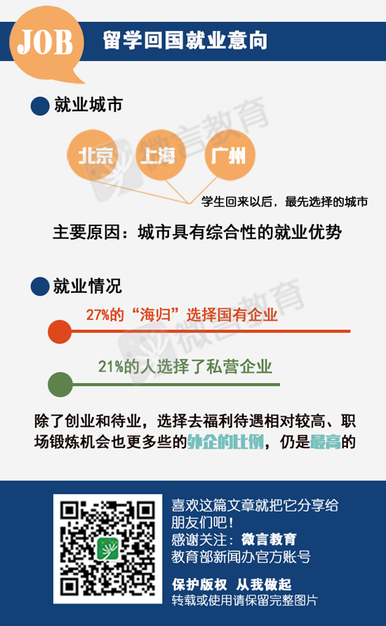 此外,近年来的统计还显示,有27%的“海归”选择国有企业,个中的原因很有意思,因为是父母支持了他们自费留学,所以,当他们回国之后,很多孩子是尊重了父母的意愿去了国有企业。另外有21%的人去了私营企业。当然,除了创业和待业,选择去福利待遇相对较高、职场锻炼机会也更多些的外企的比例,仍是最高的。