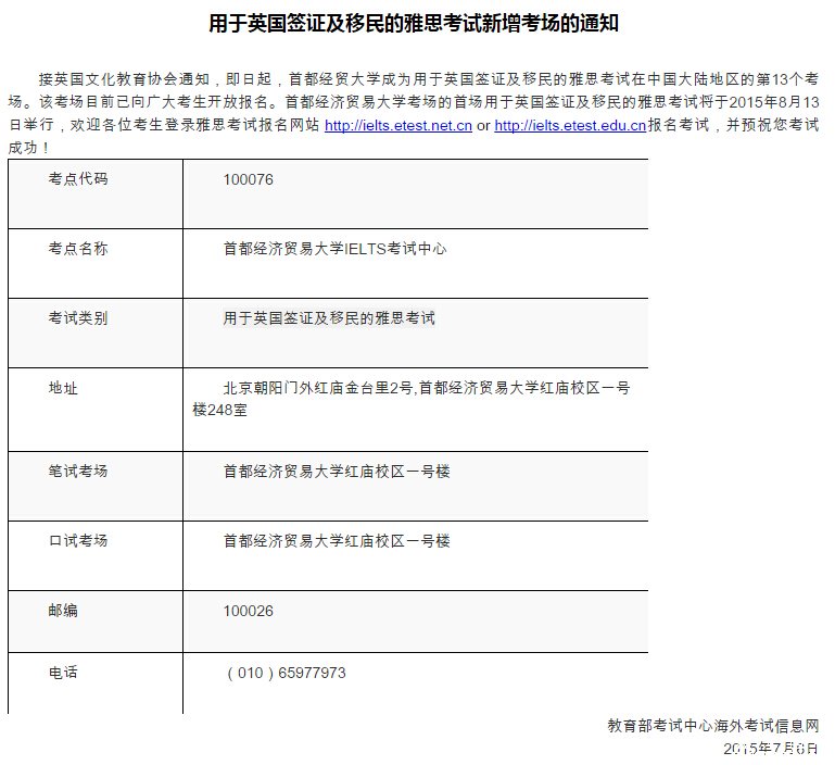 接英国文化教育协会通知,即日起,首都经贸大学成为用于英国签证及移民的雅思考试在中国大陆地区的第13个考场。该考场目前已向广大考生开放报名。首都经济贸易大学考场的首场用于英国签证及移民的雅思考试将于2015年8月13日举行,欢迎各位考生登录雅思考试报名网站 http://ielts.etest.net.cn or http://ielts.etest.edu.cn报名考试,并预祝您考试成功!
