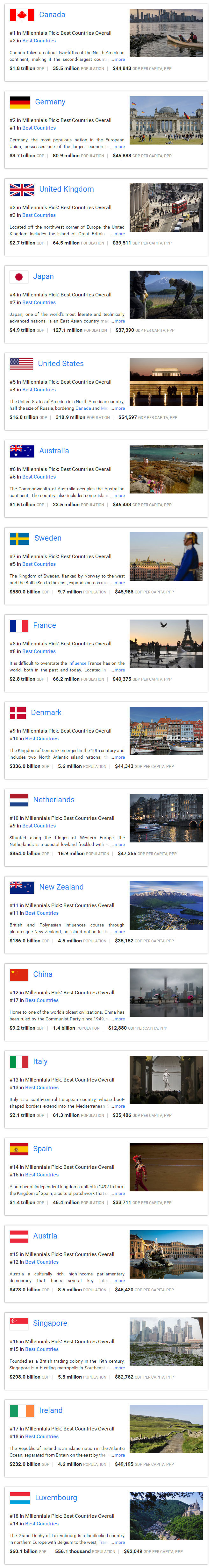 2016年US NEWS:年轻人最喜欢的国家总排名。Millennials Pick Best Countries Overall Full List。