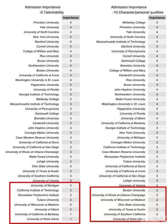由斯坦福大学、哈佛大学和加州伯克利大学的毕业生共同创建的知名教育咨询公司Synocate,根据多年来对学校招生标准的了解及内部资料总结出了一份庞大的数据报告,该报告将美国各大学本科申请时的19个影响因素的重要性进行了对比分析,直观地展现了不同的美国大学在招生时更注重因素。