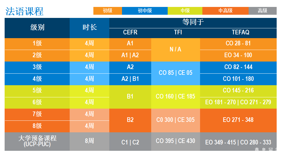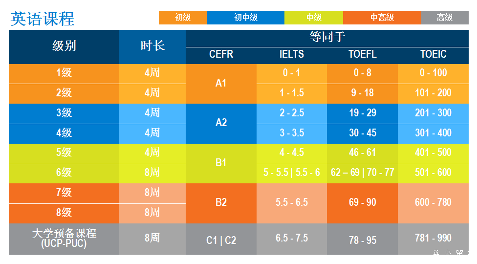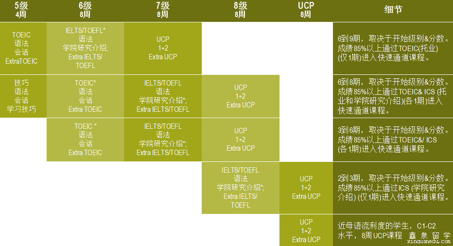 课程长度:根据学生英语水平而定。一般语言中心分为几个级别,学生入学后学校会根据学生英语水平定级,所以英语水平越高,所需时间越短,一般中国本科在读生需要3-8个月通过语言关。