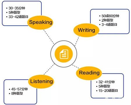 PTE学术英语考试(Pearson Test of English Academic)考试时间约为3个小时,包含一个不计分的自我介绍(Self-introduction),和口语与写作、阅读、听力三个正式部分。考试首先进行自我介绍部分,时常约为1分钟。自我介绍两三句话即可,内容包括但不限于考生的兴趣、学习计划等。自我介绍结束后即进入正式考试。正式考试各部分的时间和题量分布如图: