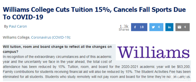 威廉姆斯学院可以说最富有的文理学院,坐拥29亿捐赠基金,也宣布2020年学费和食宿共降低15%,如果划去折扣,学费和食宿花费是63200美元。