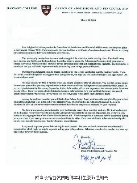每年,在超过2000份寄往世界各地的录取通知书上,威廉会一份一份地署上自己的名字,并在其后亲笔写道:“希望你成为我们的一员(Hope you’ll join us)。”