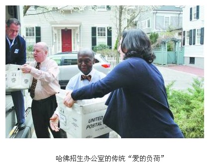 每到3月底,整个哈佛招生办公室就会全员出动,从扎着领结的招生负责人,到穿着运动T恤的学生志愿者,大家排成长队,接力将一箱箱的录取答复邮件从办公室搬运到邮寄卡车上。