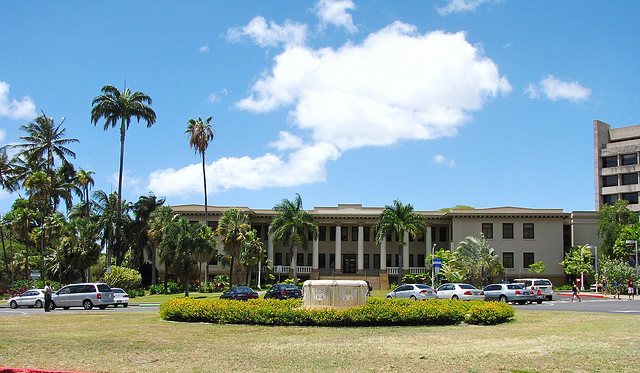 全美最美的校园第10位 University of Hawai at Manoa 夏威夷大学的历史可以追溯到1907年成立的夏威夷农业和机械工艺学院,于1920年正式获得夏威夷大学的名称,夏威夷农业和机械工艺学院并入其中,并逐步扩充至十个校区,形成夏威夷大学系统。夏威夷大学的主校区位于Manoa Valley(孟诺雅)山谷, 这里拥有最大规模和最先进的教学设施,是一所具备国际水平的研究性大学。