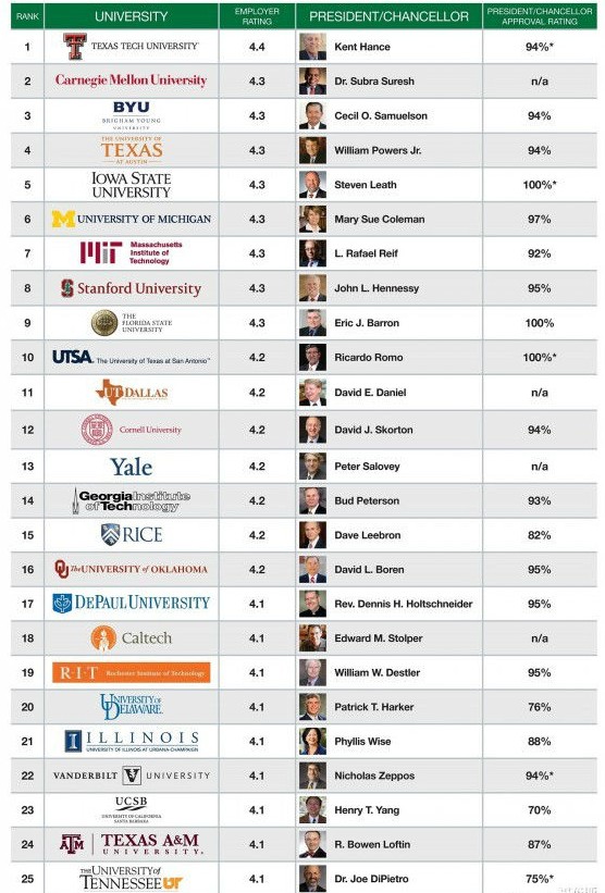 除了排出美国雇主口碑最好的高校外,Glassdoor网站还关注那些得分最高的大学校长。根据员工们的反馈,佛罗里达州立大学的埃里克•J.巴伦(Eric J. Barron)、爱荷华州立大学的史蒂文•里斯(Steven Leath)以及德克萨斯圣安东尼奥分校的里卡多•罗莫(Ricardo Romo)都获得了100%的支持率(尽管关于里斯和罗莫的反馈不到20份)。 “这份美国大学成绩单显示,一些大学可能不仅在招生方面具有竞争力,作为工作单位也毫不逊色,尤其是上榜的这25所大学。”祖潘说道。“另外值得注意的是,大学校长们的得分都很高,支持率全部达到或超过70%——Glassdoor网站上所有雇主的CEO平均支持率,打分反映了员工对于他们的领导工作的评价。”