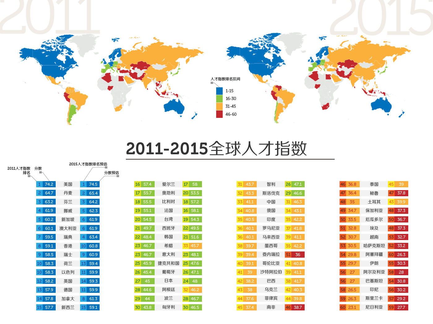 这份名为《全球人才指数:2015展望》的报告对60个国家的人才吸引力进行了评估和预测。美国在2011年和2015年的全球人才指数排名中均位居首位,且领先优势尤为明显。如此显著的优势,其首要贡献来源于美国众多的优秀大学。在全球前 500 名高校中有大约 1/3 来自美国。其他因素还包括高度专业化的团队,多元包容、鼓励创新的环境,灵活实用的劳动法规,这些因素均促进并激励人才的培养、引进及保留。