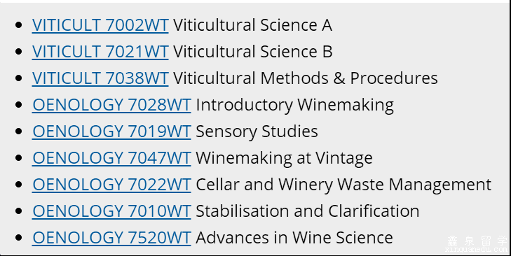 必修课程: 葡萄酒技术/酿酒系统、葡萄酒酿造科学的进步、VEN研究生集团研讨会、小组学习、研究生研究