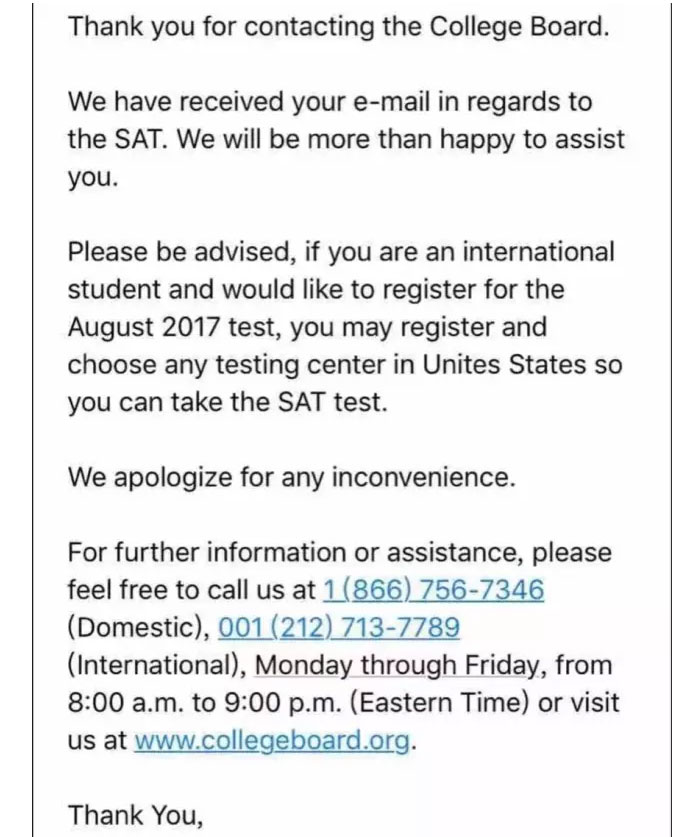 Collegeboard官网宣布,6月份的SAT国际生考试取消!20178年和2018年度,美国本土外SAT考试次数减少至四次。6月份SAT考试将被取消!我们该如何应对?