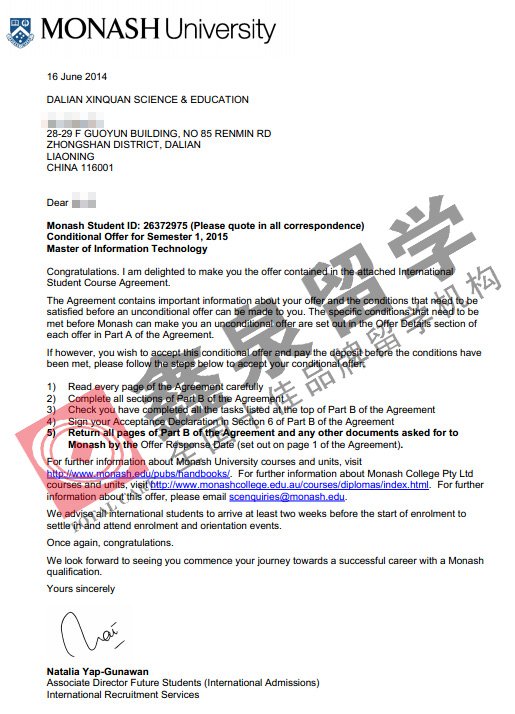 澳洲莫纳什大学IT硕士申请条件真实案例:L同学毕业于大连海事大学轮机工程专业,雅思成绩6.0,GPA76,在鑫泉留学的帮助下顺利申请到了澳洲莫纳什大学IT硕士。