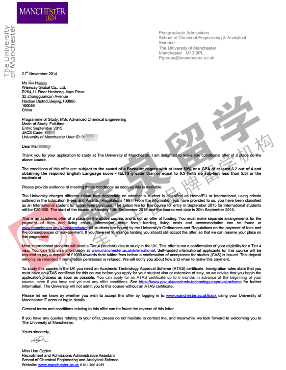 英国曼彻斯特大学化学工程硕士申请条件及案例:H同学就读于河北科技大学化学工程与工艺专业,申请时无语言成绩,GPA83%,在鑫泉留学的帮助下顺利的转学申请到了英国曼彻斯特大学化学工程硕士。