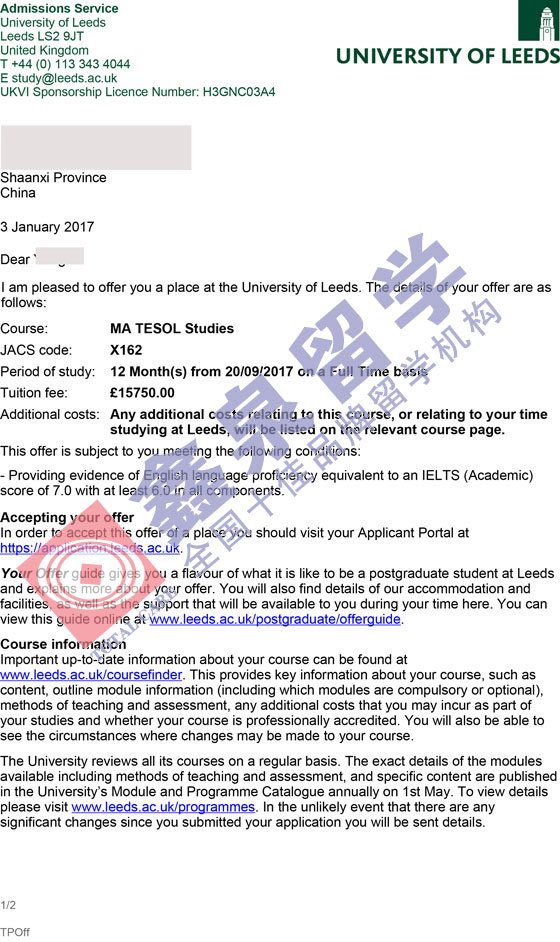 利兹大学TESOL专业硕士申请条件及案例:在鑫泉留学老师的指导下,就读于西安外国语大学的Z同学,GPA81%,申请到了利兹大学TESOL专业硕士。