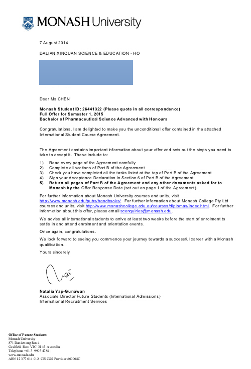 陈同学找到我的时候已经是七月份,距离国外院校二月份的开学期只剩半年,申请时间非常紧张,但是孩子自身的背景很棒,IB分数35分,雅思已经考到7.5,我们给孩子定的院校锁定在澳洲八所五星级大学中,最终根据孩子选择的专业,敲定了墨尔本大学,威尔士大学'>新南威尔士大学,莫纳什大学这三所大学,经过两个月的等待,在鑫泉留学的帮助下,三所大学全部给予了本科直读的无条件offer,对于在国内的高中毕业生,没有参加高考,通过IB,或者A-level的优异成绩,无需读预科,一样可以申请到澳洲的顶尖名校。
