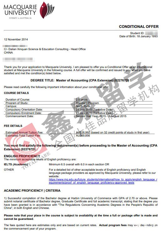 澳洲麦考瑞大学会计专业硕士申请条件真实案例解析:C同学毕业于哈尔滨商业大学会计专业,雅思成绩6.0,平均分为85%,在鑫泉留学的帮助下顺利的申请到了澳洲麦考瑞大学会计专业硕士。