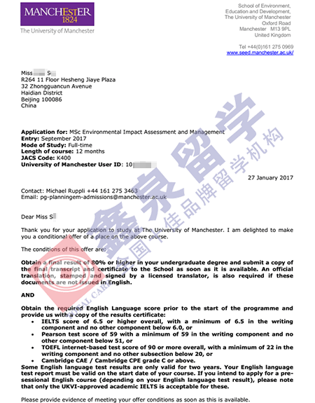 曼彻斯特大学环境影响评估与管理硕士及案例分析:S同学毕业于河北工业大学,GPA87%,申请时暂无雅思成绩,在鑫泉留学的帮助下顺利的申请到了曼彻斯特大学环境影响评估与管理硕士。