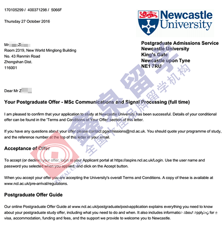 录取院校和专业:纽卡斯尔大学通讯与信号处理专业硕士