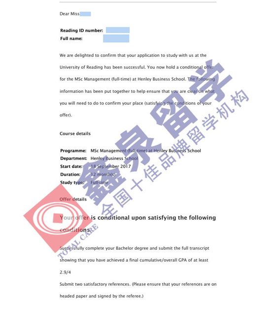 经过鑫泉留学咨询顾问王丽滨老师详细,耐心的分析了以上三所学校的优劣势以后,学生最终选择了雷丁的亨利商学院。