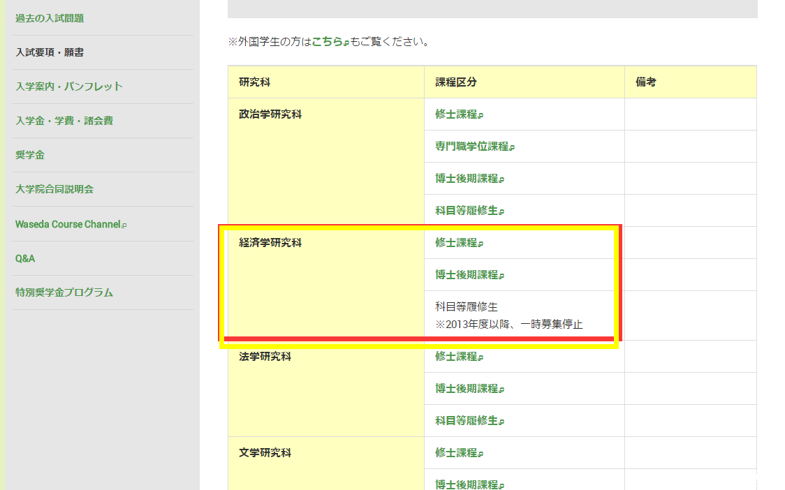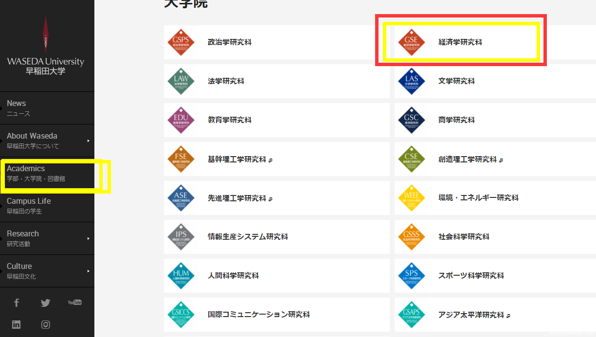 进入之后,我们找到大学院,找到和报考专业相近的研究科,比如早大的商学研究科,一般就是经营学的同学会报考的研究科。其实经济的同学早大商,也能考。