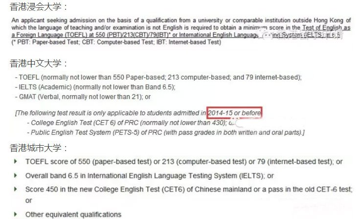 目前除了城市大学的官网还显示接受六级外,其他几所学校年都相继定了不再接受六级的规定了。港中文有些项目如果你提交的GMAT verbal达到21+分的话,是可以替代托福雅思的。综上,还是建议申请香港的小伙伴们考个雅思或者托福哦!而且如果达不到项目的最低要求,学校基本都 不会审核你的材料。