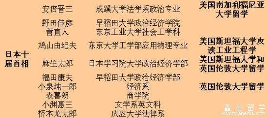 因为日本换首相的频率跟楼下店铺换老板的频率差不多,所以小编就只盘点了一下首相的专业和学历背景。虽然日本首相也多是文科生出身,但这不是最大的亮点。通过这10届首相的求学经历不难发现,10名首相中,5名有海外求学经历,而且多数是美国和英国的高校。看来日本首相肯定觉得别人家的大学好。
