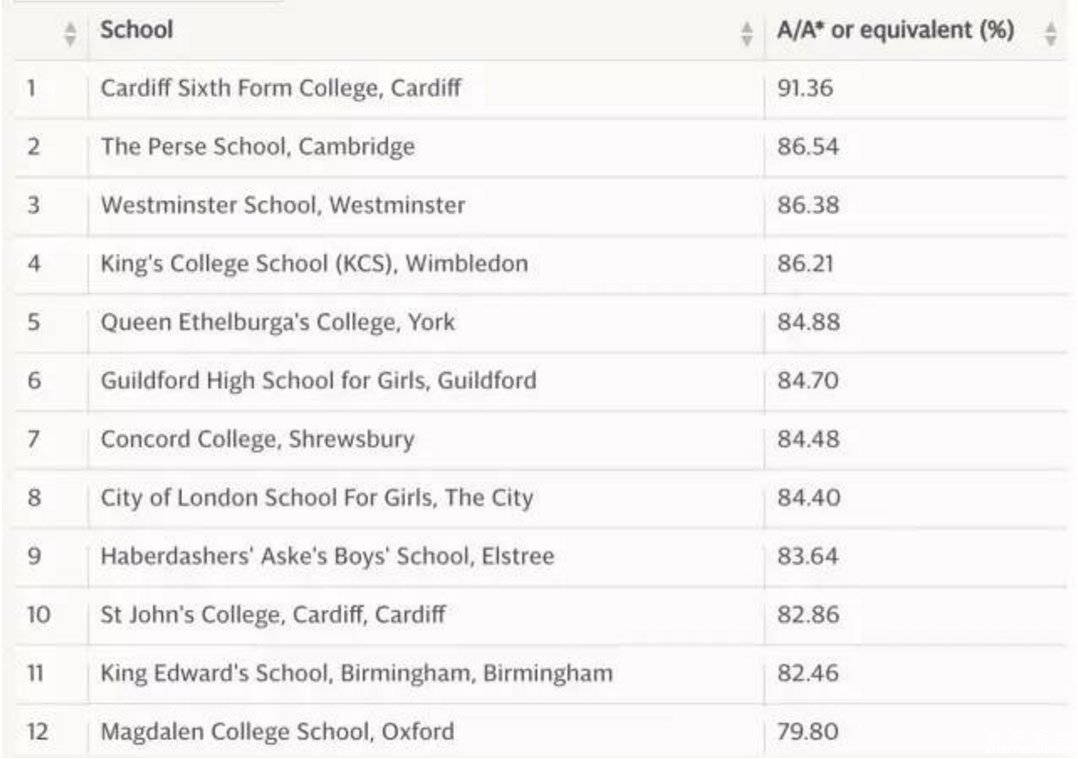 和去年一样,卡迪夫中学 (Cardiff Sixth Form College)仍然以绝对优势稳居排行榜第一的位置。