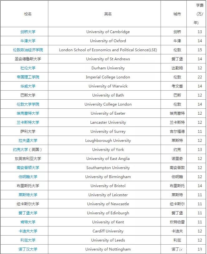 小编为大家罗列了英国一些城市的本科学费大致情况